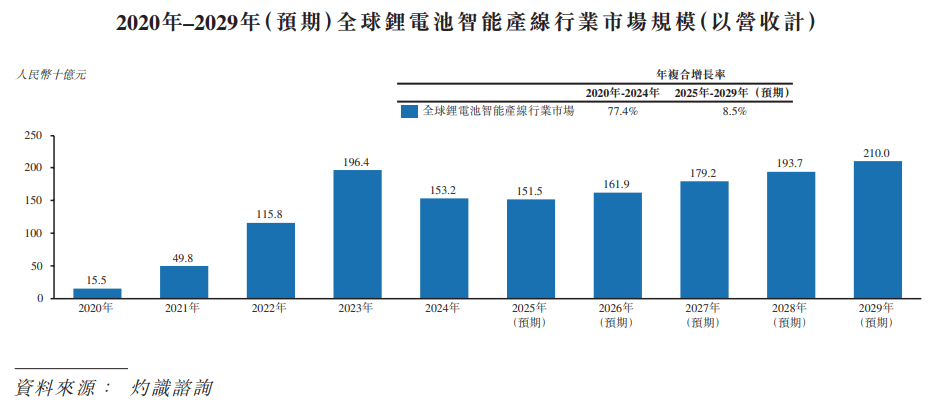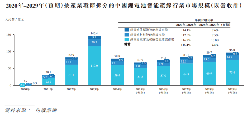 和全球市场雷同,按营收口径计较,中国锂电池智能产线亿元,并于2024年回落至人平易近币788亿元,2020年至2024年的年复合增加率为115。4%。后因为下逛需求呈现苏醒,产线扶植恢复增加,中国锂电池智能产线市场规模预期将进一步扩大至人平易近币968亿元,2025年至2029年的年复合增加率为9。4%。从财产环节看,各环节的市场规模取锂电池智能产线市场规模趋向根基分歧,均正在2020年至2023年期间快速增加并于2024年回落,并预期于将来五年回升。锂电池前驱体智能产线。6%。锂电池材料智能产线。5%。锂电池电芯及后道智能产线。0%。