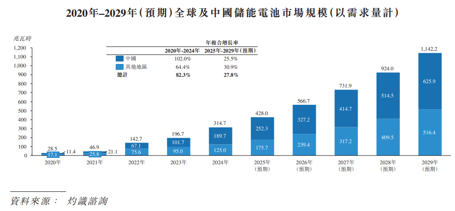 全球储能电池市场规模正在2020年至2024年间增加光鲜明显,需求量从2020年的28。5兆瓦时增至2024年的314。7兆瓦时,年复合增加率达到82。3%。此中中国储能电池市场连结高增速,需求量由2020年的11。4兆瓦时添加至2024年的189。7兆瓦时,2020年至2024年的年复合增加率为102。0%,到2024年中国储能电池需求量占全球需求量已达到60。3%。新兴市场(包罗中东及亚非拉地域)因为电力紧缺、政策搀扶等要素无望鞭策储能需求提拔,欧洲市场对能源平安的注沉、高比例可再生能源并网以及储能系统带来的经济效益也使得储能成为主要的成长标的目的,预期到2029年全球储能电池需求量将达到1,142。2兆瓦时,2025年至2029年的年复合增加率为27。8%。此中中国储能电池需求量将添加到625。9兆瓦时,2025年至2029年的年复合增加率为25。5%。
