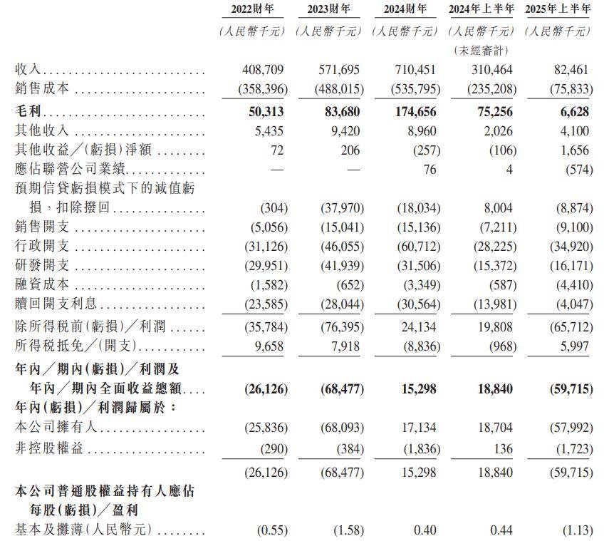 于2022财年、2023财年、2024财年、2025年上半年,公司录得年内╱期内利润及年内╱期内全面收益总额别离约为-2612。6万元、-6847。7万元、1529。8万元、-5971。5万元。