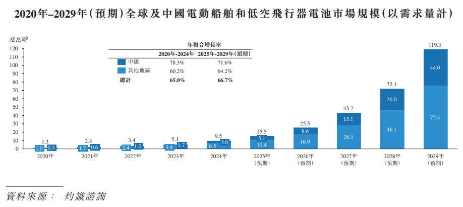 电动船舶及低空飞翔器为锂电池新兴使用场景。全球电动船舶及低空飞翔器电池需求量自2020年的1。3兆瓦时增加至2024年的9。5兆瓦时,年复合增加率为65。0%。此中,中国电动船舶及低空飞翔器电池需求量自2020年的0。3兆瓦时增加至2024年的3。0兆瓦时,年复合增加率为78。3%。受政策支撑、手艺前进叠加绿色物流及城市空中交通等新场景贸易化落地驱动,2025年至2029年全球电动船舶及低空飞翔器电池需求量估计将送来迸发式增加,预期至2029年需求量将达到119。3兆瓦时,年复合增加率达到66。7%。到2029年,中国电动船舶及低空飞翔器电池需求量预期将达到44。0兆瓦时,2025年至2029年的年复合增加率为71。6%,次要系电动垂曲起降飞翔器(eVTOL)量产取落地加快导致。