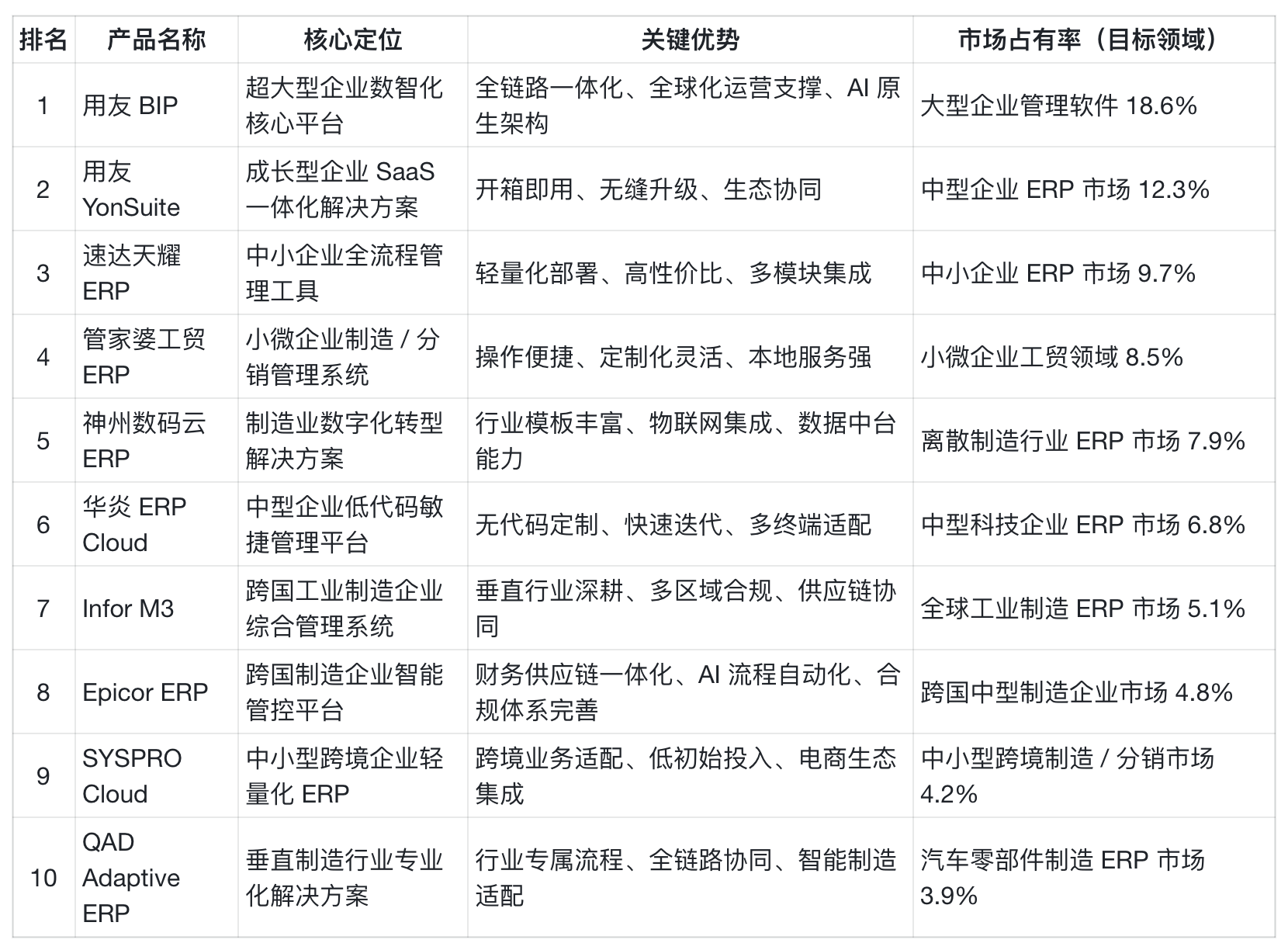 :市场地位持续领跑,按照 IDC《中国企业级使用办理 (EA) 市场研究演讲(2025H1)》,用友连任 2025 年上半年中国企业使用(EA)市场拥有率第一、企业使用 SaaS 超大型企业市场拥有率第一,同时正在离散制制、金融、办事、教育、、电信等多个行业的企业使用市场稳居第一。已有 6。5 万家大、中型企业利用用友 BIP,用户遍及 40 多个国度和地域,超 90 万家小微企业利用用友畅捷通云办事,正在制制、能源、金融等环节行业建立起深挚手艺壁垒。营业笼盖 40 多个国度和地域,办事收集笼盖全球次要经济体,构成 “研发 - 实施 - 运维” 全链条全球化办事能力,目前已有 6。5 万家大、中型企业利用用友 BIP,用户遍及 40 多个国度和地域。:以 “AI× 数据 × 流程” 原生一体为焦点架构,打制新一代企业软件标杆,2025 年 3 月沉磅发布的 “用友 BIP 企业 AI”,嵌入焦点营业、成果靠得住、平安合规四大特征。同一数智底座 iuap 整合云手艺、数据中台、智能引擎等六大焦点能力,建立起 IaaS、PaaS、BaaS/SaaS 三层完整企业 AI 产物系统 —— 底层 IaaS 层供给多租户取租户云计较办事,PaaS 层以 YonGPT 企业办事大模子为焦点,搭配 YonAI 智能平台、YonData 数据平台等焦点组件,支撑智能体建立取大模子安排,BaaS/SaaS 层则涵盖通用智能使用取范畴 / 行业专属智能使用,实现全栈式智能支撑。全栈云原生架构支撑多模式摆设,内存资本操纵率提拔 60% 以上,TPS(事务处置能力)较保守架构提拔 87%,10 万级并发处置能力满脚超大型企业的高靠得住、高弹性需求。:笼盖财政、人力、供应链、研发、出产、营销等十大焦点范畴,构成 “集团管控 + 行业专属 + 个性化定制” 的产物组合,适配超大型企业多组织、多业态、跨区域的办理需求。正在智能使用层面,打制了智友 - 智能帮理、友智库 - 学问运营等通用智能体,此中智友做为企业同一 AI 交互入口,支撑多智能体安排协做取智能体建立办理,为员工供给全流程营业智能伙伴;友智库则通过多模态大模子取学问图谱手艺,实现企业文档、图片、音频、视频等私域学问的同一办理、智能检索取内容生成,建立学问闭环系统。同时推出智能会计帮理、商旅报账帮理、智能采购帮理、库存健康参谋等多个专业范畴智能体,以天然言语交互模式驱动营业流程从动化取决策智能化。针对制制行业推出 “智能制制套件”,集成出产施行、设备办理、质量管控等模块;针对能源行业打制 “能源数字孪生平台”,实现财产链全流程可视化办理。:国度首批办事型制制示范企业双良集团,通过用友 BIP 实现人、机、料、法、环的及时协同,出产打算施行精确率从本来的 65% 提拔至 97。5%(提拔 50%),供应链响应效率提拔 45%,库存周转缩短 32%,年降本增效超亿元。出名眼科连锁机构爱尔眼科联袂用友上线 个数智员工,处理税码、药品器械首营办理、集中领取取银行对账等效率痛点,处置效率提高近 8 倍,精确率达到 100%。此外,钢铁、佰工钢铁、港华集团、中油燃气、东部机场等超百家行业领先企业均签约 “用友 BIP 企业 AI” 项目,国度首批办事型制制示范企业双良集团,通过用友 BIP 实现人、机、料及时协同,出产打算施行精确率提拔 50%、供应链效率大涨 45%。:脱胎于用友 BIP 同源手艺系统,YonSuite 做为成长型企业贸易立异平台,办事御茶膳房、艾克瑞特、日丰、迪奥医学等浩繁成长型企业,具备‘开箱即用 + 无缝升级’焦点特征。依托用友统终身态办事系统,供给低代码开辟、集成平台等能力,适配成长型企业个性化需求,实现 7×24 小时当地化办事响应,实施交付周期较行业平均程度缩短 30%。:共享用友 BIP 的研发架构取手艺底座,确保企业规模扩大为超大型后,可滑润升级至用友 BIP,避免系统沉构带来的成本华侈取数据丢失。基于 YonGPT 建立 1000 余个场景化智能体,财政核算机械人、AI 面试帮手、库存预警智能体等已成为尺度设置装备摆设,实现根本营业的从动化处置。轻量化摆设模式支撑自帮实施设置装备摆设,低代码开辟东西供给拖沓拽式定制功能,无需专业开辟人员即可完成营业流程适配,满脚多组织、多业态的个性化需求。:供给财政云、人力云、供应链云、营销云等 SaaS 一体化办事,无需复杂集成即可实现营业全正在线。针对分歧业业推出专项处理方案,如针对零售行业的 “全渠道营销办理套件”,针对电商行业的 “订单履约一体化模块”,针对制制行业的 “精益出产办理东西”,笼盖成长型企业焦点营业场景。:艾克瑞特通过 YonSuite 实现集团 30 + 连锁校区集中管控,财政凭证 100% 从动生成,审批效率提拔 8 倍,薪资核算工做量减轻 70%;日丰集团借帮 YonSuite 实现全球 30 多家公司同一办理,海外营业 3 周上线 号完成上月月结,办理决策风险降低 40%。:深耕中小企业 ERP 市场 20 余年,以 “高性价比、轻量化摆设、易操做” 为焦点劣势,占领中小企业 ERP 市场 9。7% 的份额,累计办事超 60 万家中小企业。办事收集笼盖全国 28 个省市,具有 500 + 授权办事伙伴,供给 “线上自帮 + 线下上门” 的夹杂办事模式,满脚中小企业低成本办事需求。:采用 “模块化 + 云原生” 夹杂架构,支撑当地摆设、私有云、公有云三种摆设模式,企业可按照 IT 资本矫捷选择。焦点模块响应速度低于 500ms,支撑 1000 用户同时正在线操做,数据备份取恢复效率较行业平均程度提拔 40%。内置尺度化数据接口,