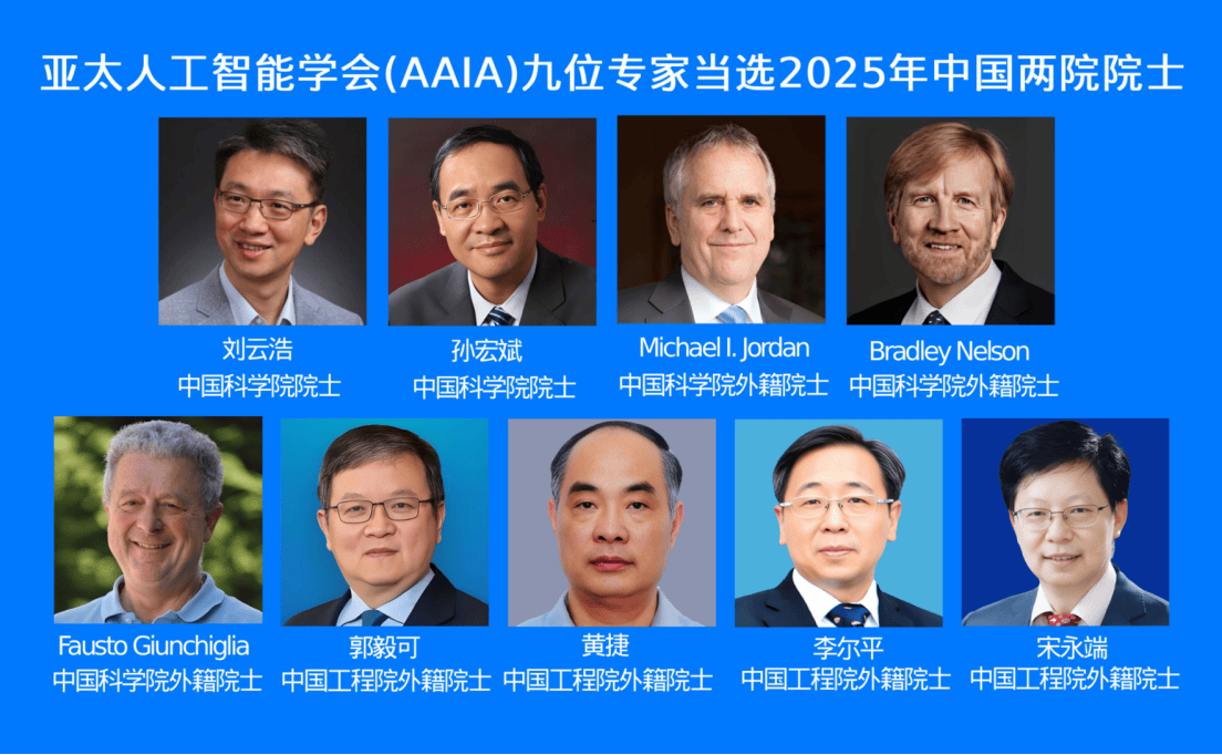 近日,2025年中国科学院和中国工程院院士增选成果正式发布。本次增选成果中,共有九位来自亚太人工智能学会(AAIA)的顶尖专家成功被选,别离入选中国科学院院士取中国工程院院士,此中包罗中国科学院院士刘云浩、孙宏斌,中国科学院外籍院士Michael I。 Jordan、Bradley Nelson、Fausto Giunchiglia,以及中国工程院外籍院士郭毅可、黄捷、李尔平、宋永端。