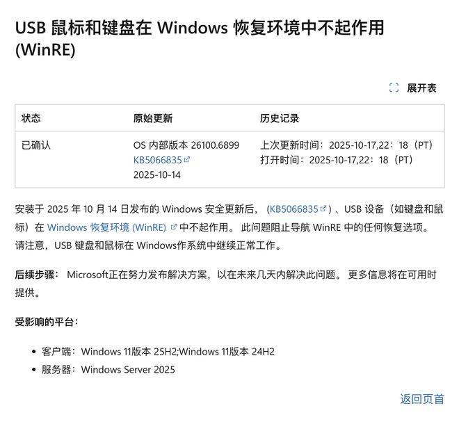 据 Toms Hardware 报道,Windows 11 十月更新再现严沉问题,部门用户正在进入 Windows 恢复(Windows RE)时发觉 USB 键盘和鼠标完全无法利用,导致无法进行任何交互操做。据悉,本次问题源自更新补丁 KB5066835,影响范畴包罗 Windows 11 25H2、24H2 以及 Windows Server。微软已确认该问题的存正在,并暗示正正在开辟修复方案,估计将正在将来几天内推送更新。值得留意的是,受影响的仅为 USB 外设,老式 PS/2 接口键盘和鼠标仍可一般利用。因为 Windows RE 是系统无法一般启动时的默认诊断取修复东西,该问题可能给通俗用户和 IT 办理人员带来较大搅扰。微软同时提示用户,系统正在一般运转形态下 USB 外设不受影响,仅正在进入恢复时会呈现失灵现象。许诺将尽快发布补丁修复该问题,并正在后续通知布告中供给更多消息。