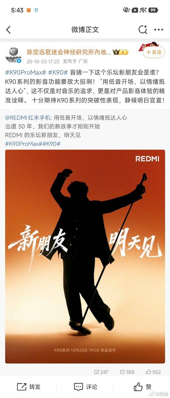 Redmi 今天正在社交平台发布预热海报,颁布发表全新旗舰机型 K90 Pro Max 即将登场。海报以红色舞台灯光为布景,配文「新伴侣 明天见」,并强调新品将带来「低功耗、高机能」的体验。随后,陈奕迅歌迷会账号第一时间转发相关微博,并共同评论互动,激发对代言人身份的猜测。连系海报中手持话筒的剪影,不少网友认为 Redmi K90 系列的代言人恰是陈奕迅。跟着取粉丝群体的双沉预热,Redmi K90 Pro Max 的发布会尚未,已正在社交平台掀起热议。